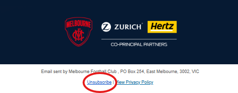 At the bottom of every email you receive from the Melbourne Football Club, you’ll find a footer containing a link that allows you to update your communication preferences.